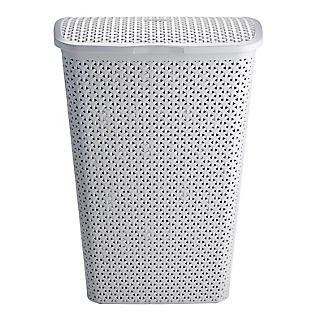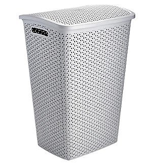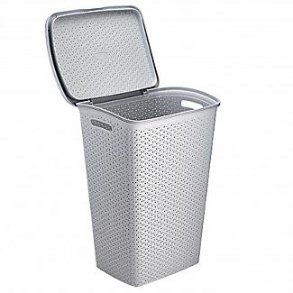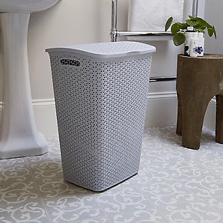 Holding a heaping pile of laundry, this large-capacity grey Laundry Hamper has an attractive faux rattan effect that ensures your dirty washing is kept well ventilated. The hinged lid stands up straight so it can be positioned against a wall, and carry handles make it easy to move about on washday.