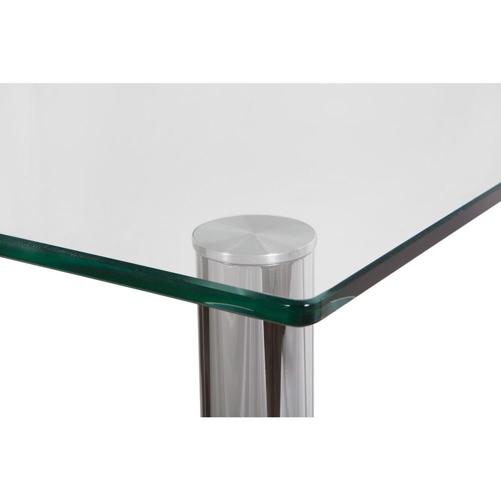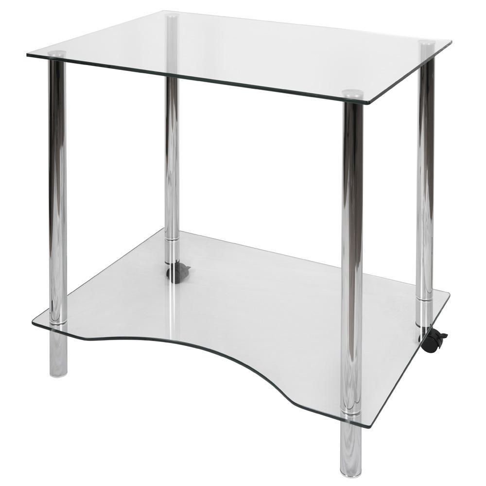 - Upgrade your workspace with this computer workstation. Featuring a clear tempered glass table top, it offers a smooth working surface and also lends a modern appeal to the setup. A matching glass shelf with a circular cut-out in the lower part of the desk makes for an easy storage solution, while also providing support to your lower body. With a minimalist design and polished, ‘high-chrome’ finished legs, it is as stylish as it is space saving.